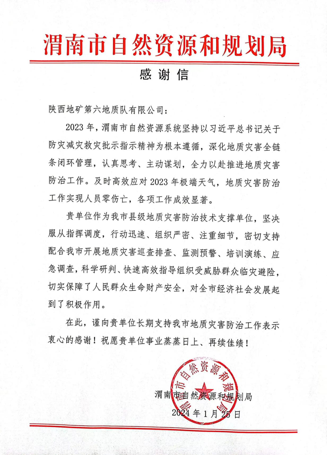 渭南市自然資源和規(guī)劃局向我公司發(fā)來(lái)感謝信